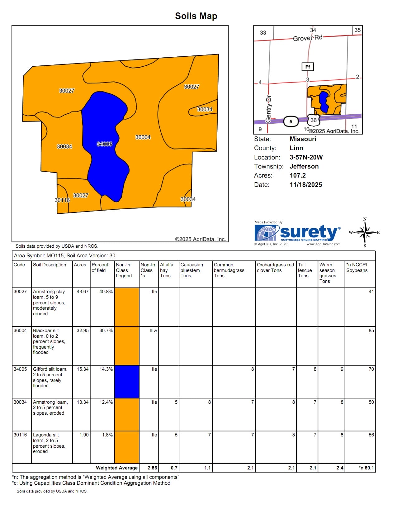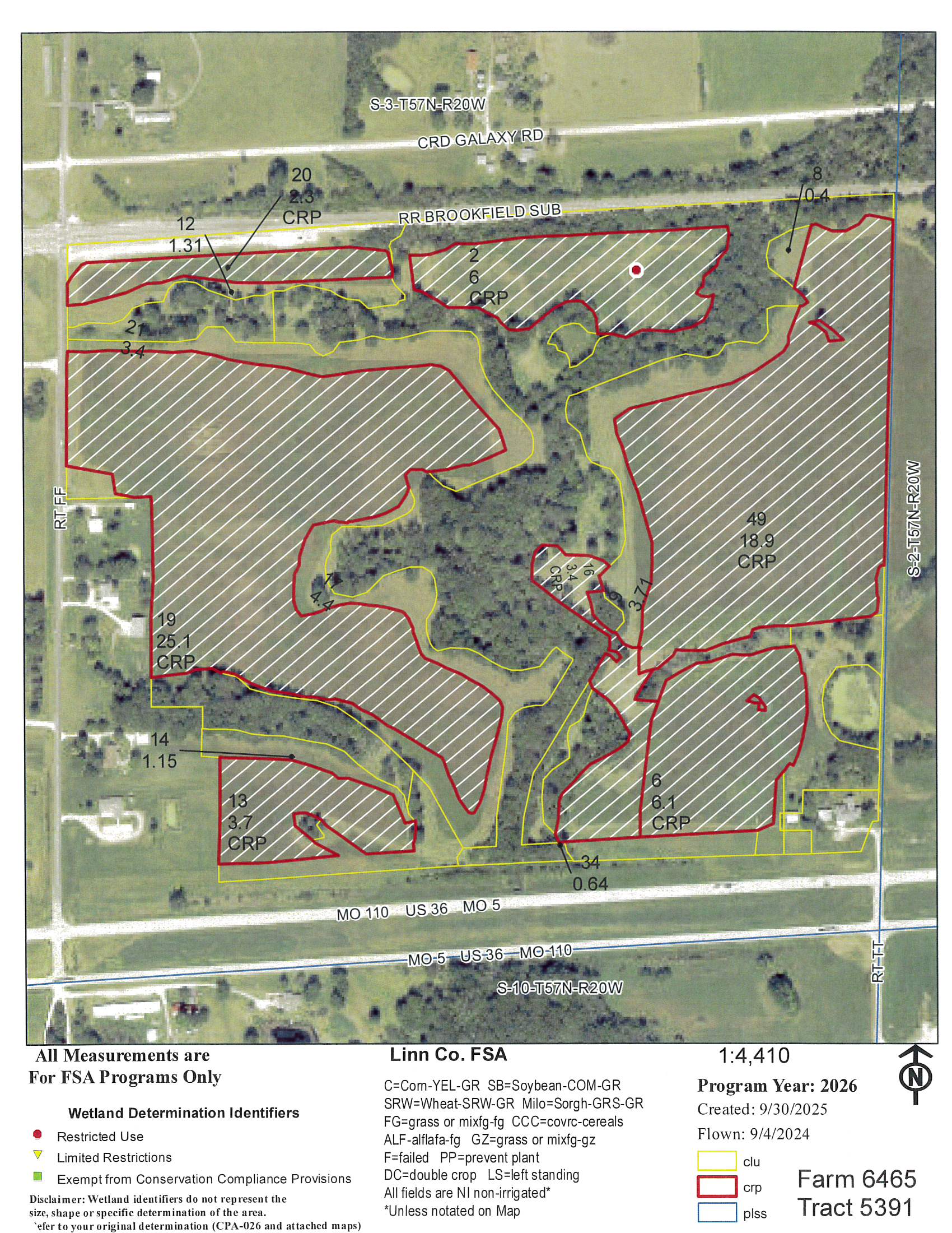 This beautiful 107.2-acre farm sits in an unbeatable location just one mile west of Brookfield, Missouri, positioned between Highway 36 to the south and Highway FF to the west for exceptional access. Nestled in the heart of Linn County, this property combines income-producing acres, mature timber, and high-quality wildlife habitat—truly a rare find for those seeking both recreation and the perfect place to build a home.