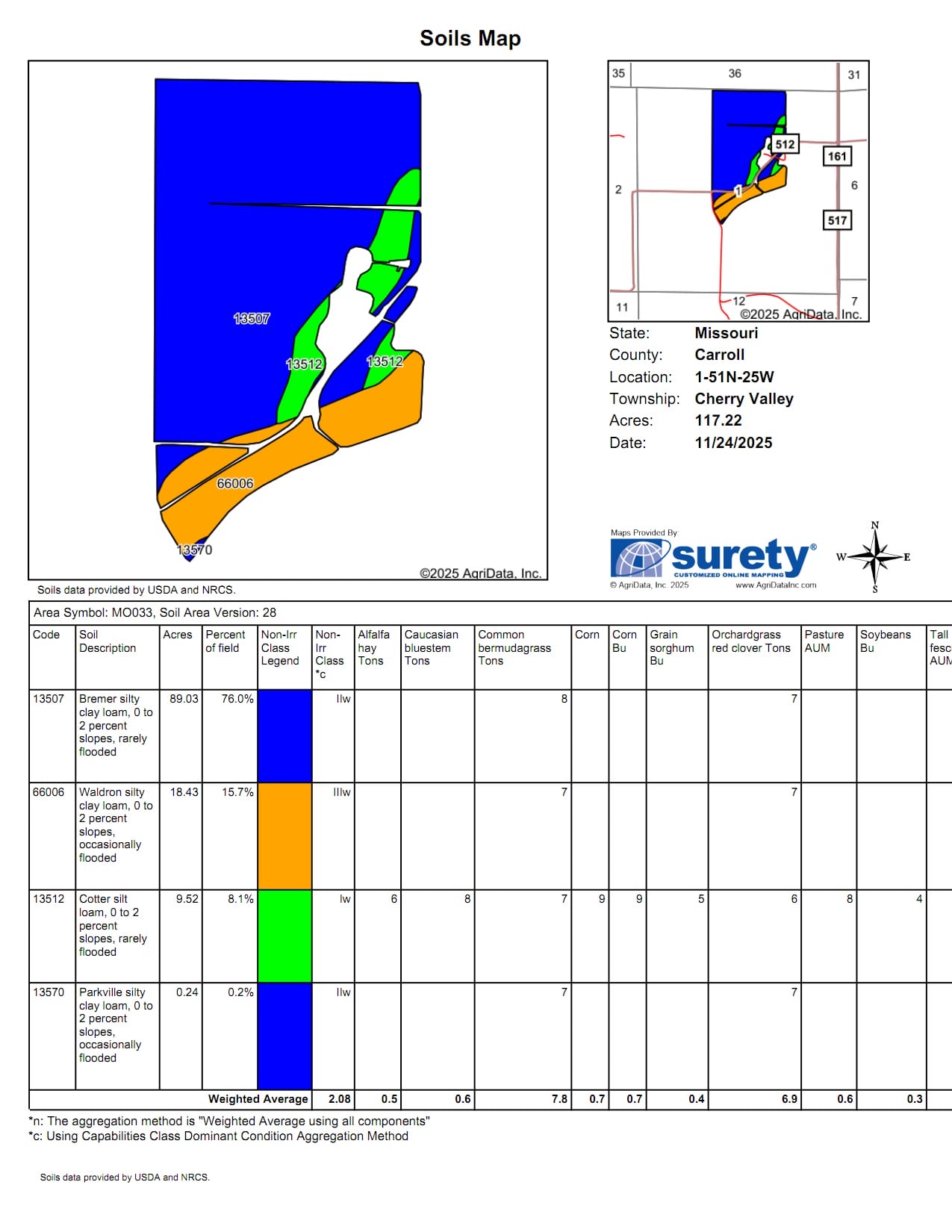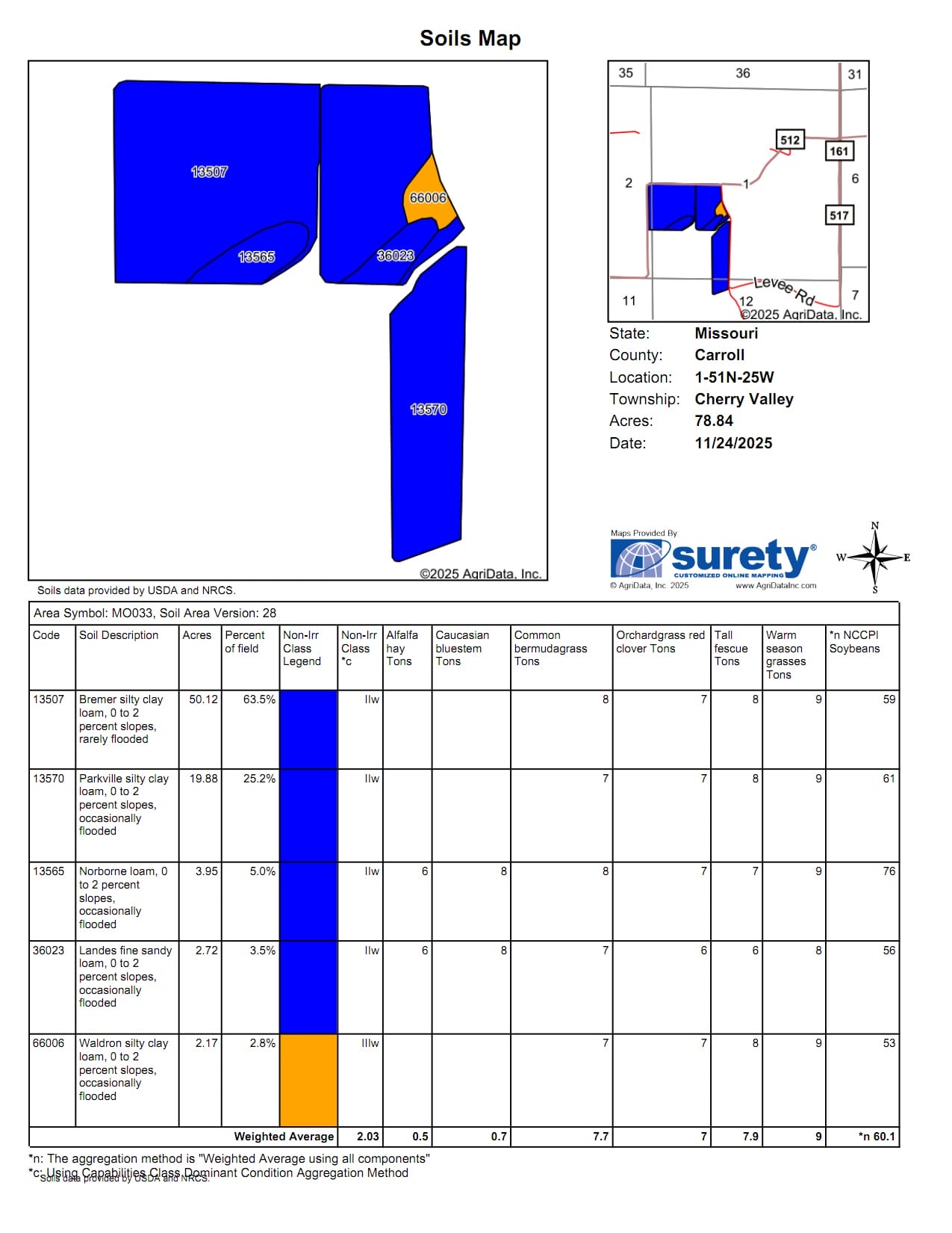 Soils: Class I Cotter Silt Loam, Class II Bremer & Parkville, Class III Waldron