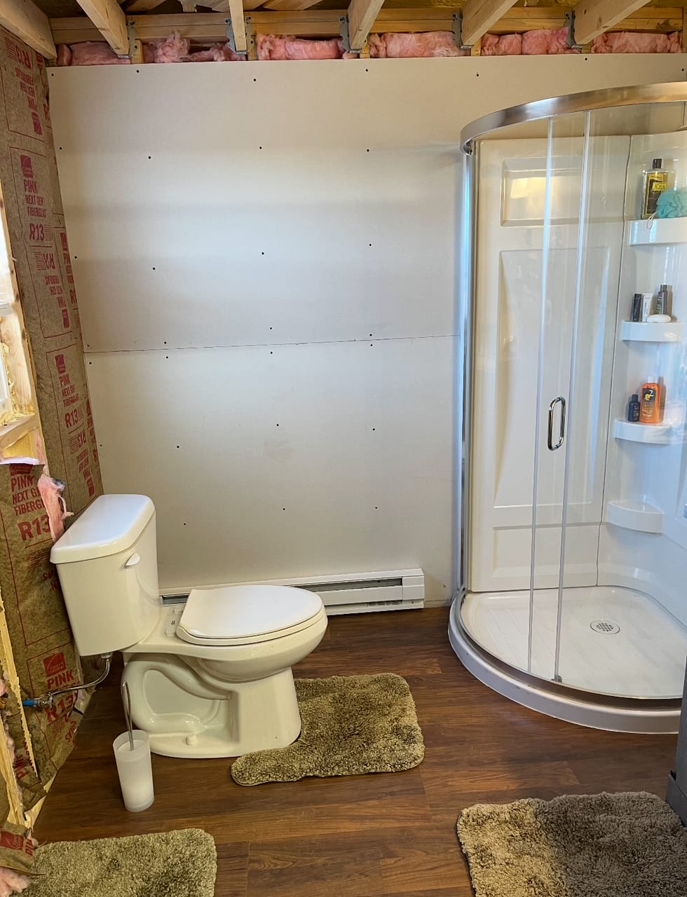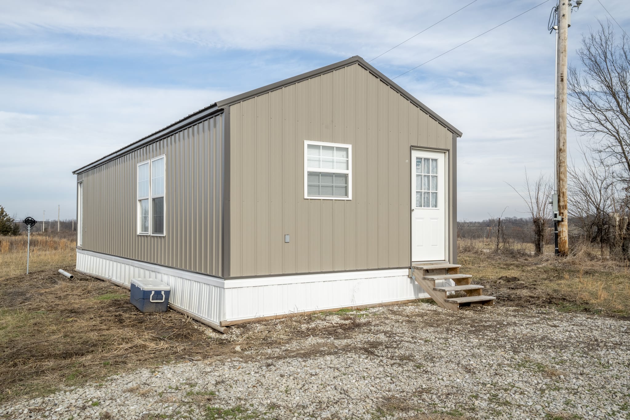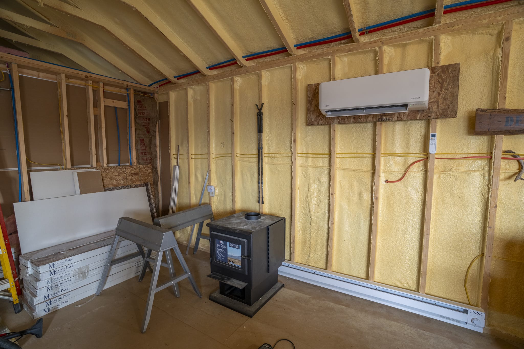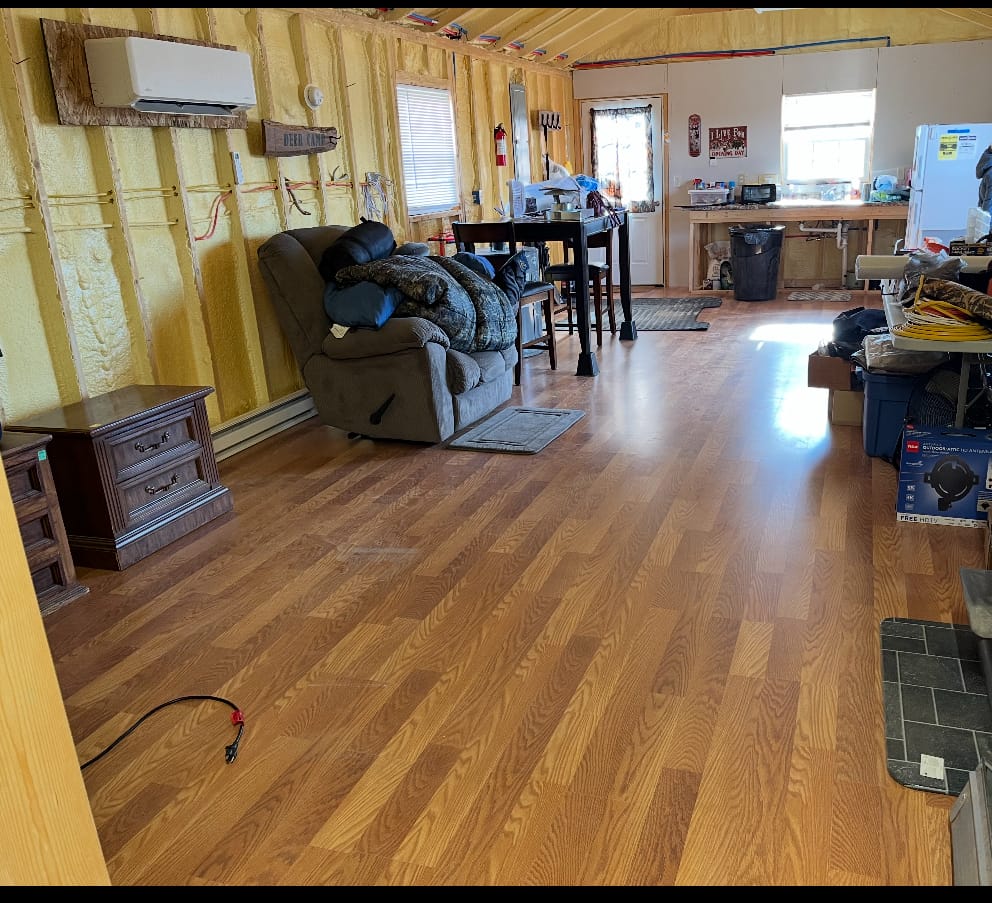 2x4 construction on piers with a crawlspace, spray foam insulation (1" ceiling,2" walls), 2 ceiling fans, 2x8 subfloor, copper wiring, double pane windows, 2 insulated steel doors, 40 gallon water heater, pex plumbing, new fridge, 2 microwaves, 2 steel strap anchors, heat trace water line, GFI receptacles, laminate flooring being installed, 200 amp service, heat pump & electric baseboard, bonus wood stove, mini split a/c and rural water.