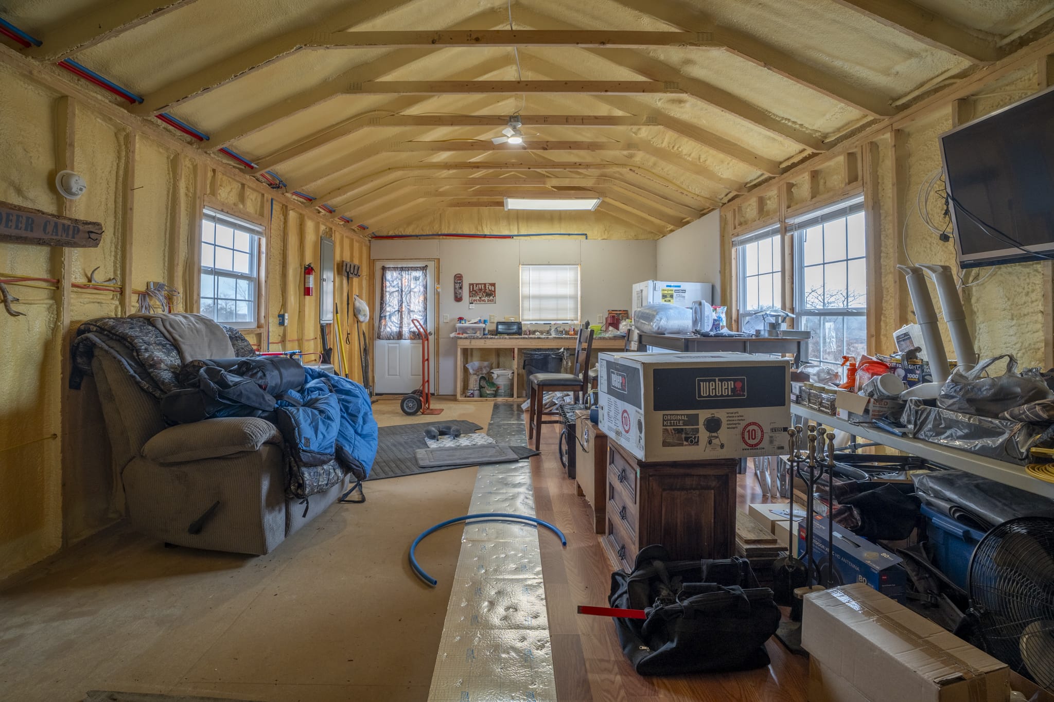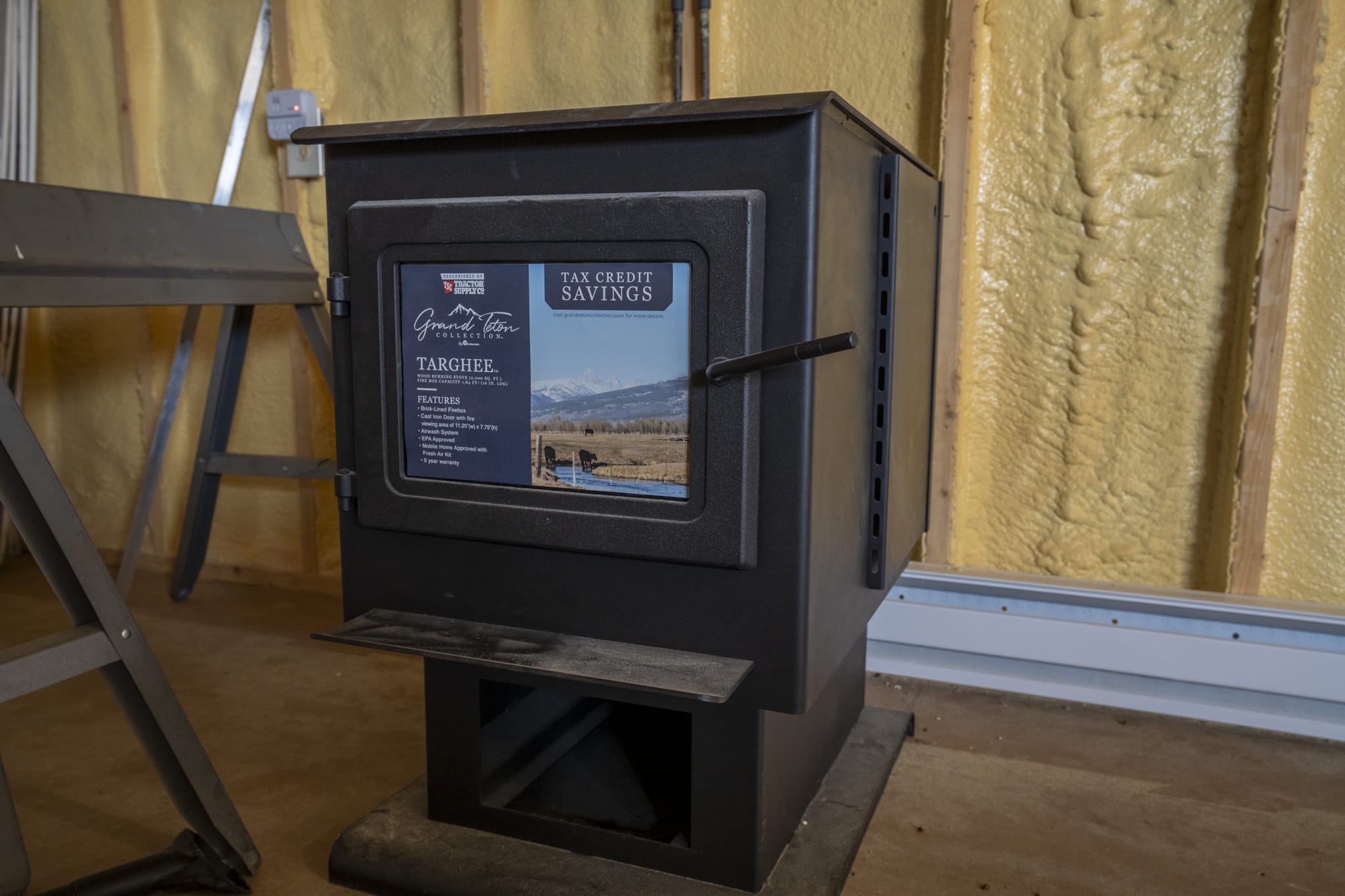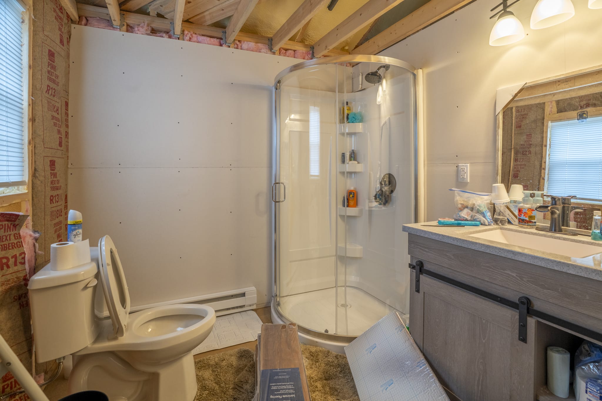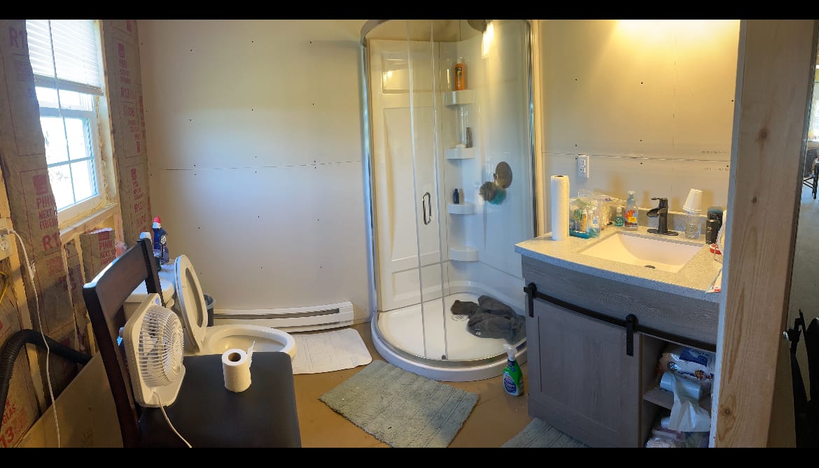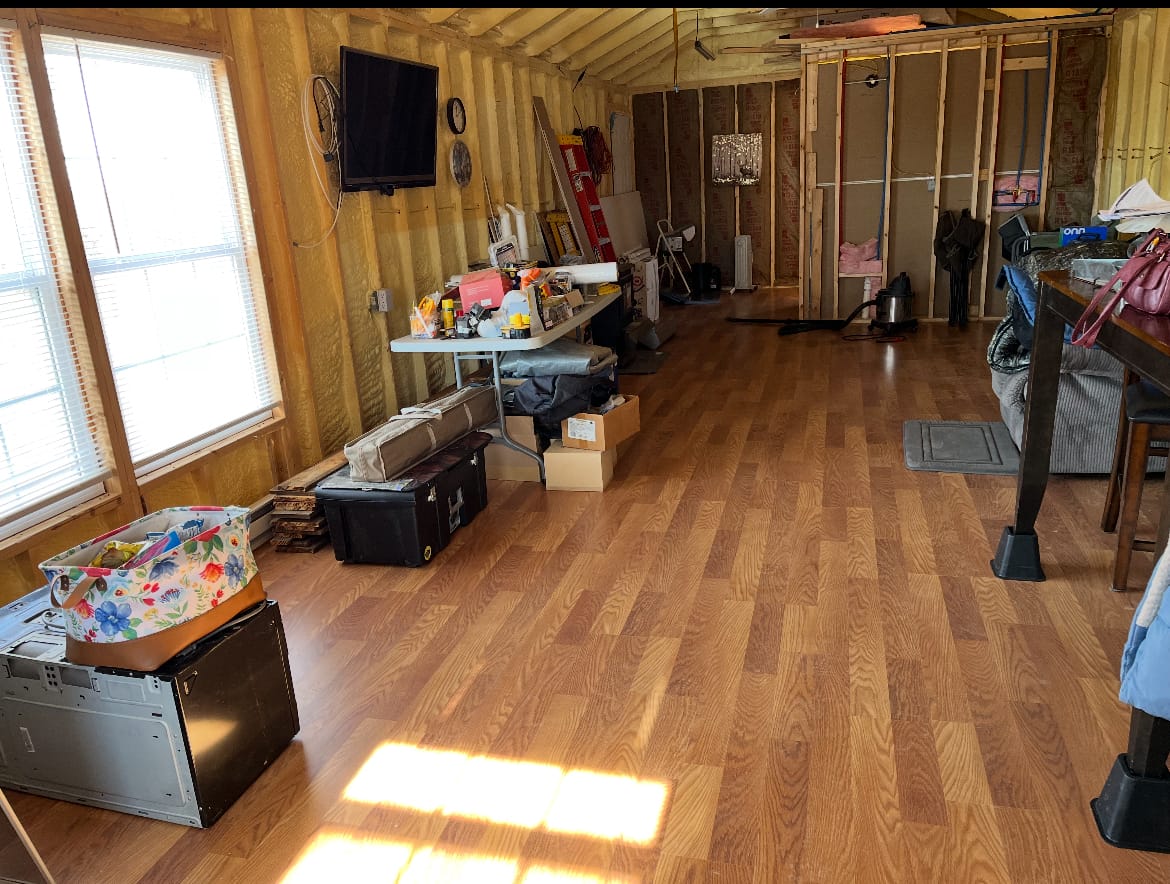 2x4 construction on piers with a crawlspace, spray foam insulation (1" ceiling,2" walls), 2 ceiling fans, 2x8 subfloor, copper wiring, double pane windows, 2 insulated steel doors, 40 gallon water heater, pex plumbing, new fridge, 2 microwaves, 2 steel strap anchors, heat trace water line, GFI receptacles, laminate flooring being installed, 200 amp service, heat pump & electric baseboard, bonus wood stove, mini split a/c and rural water.