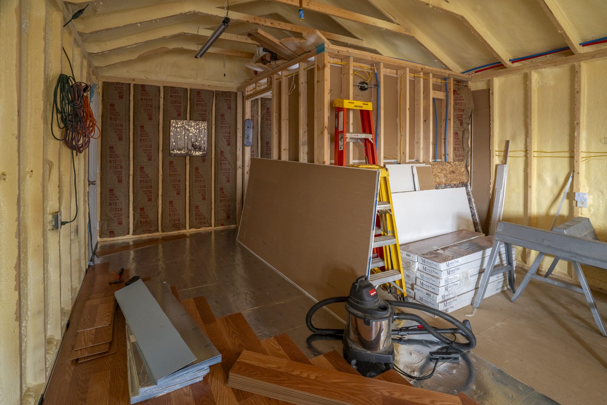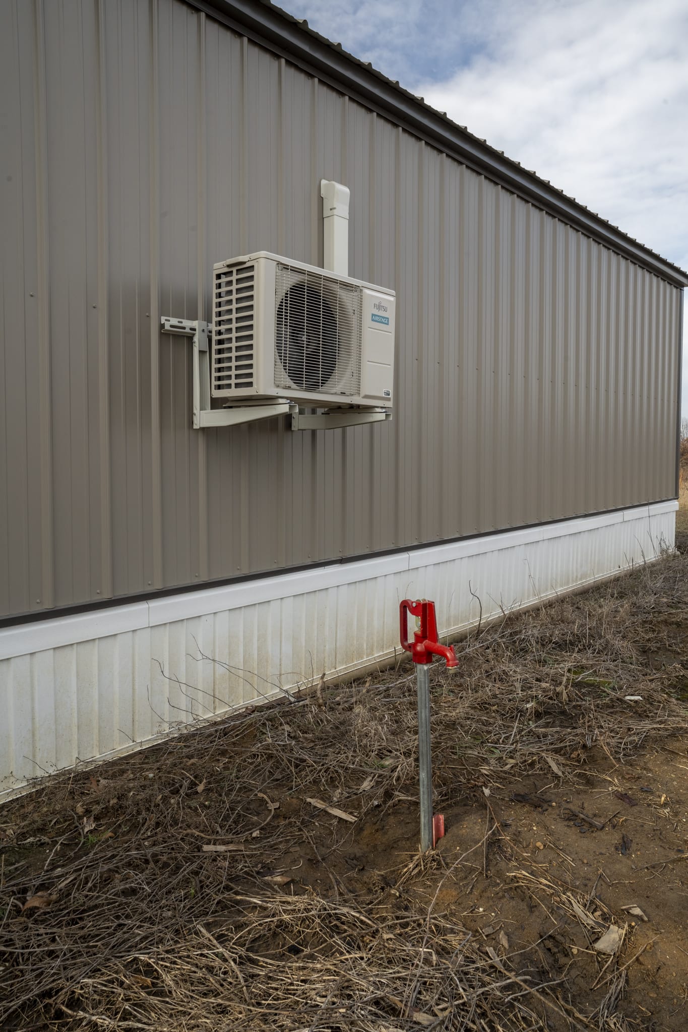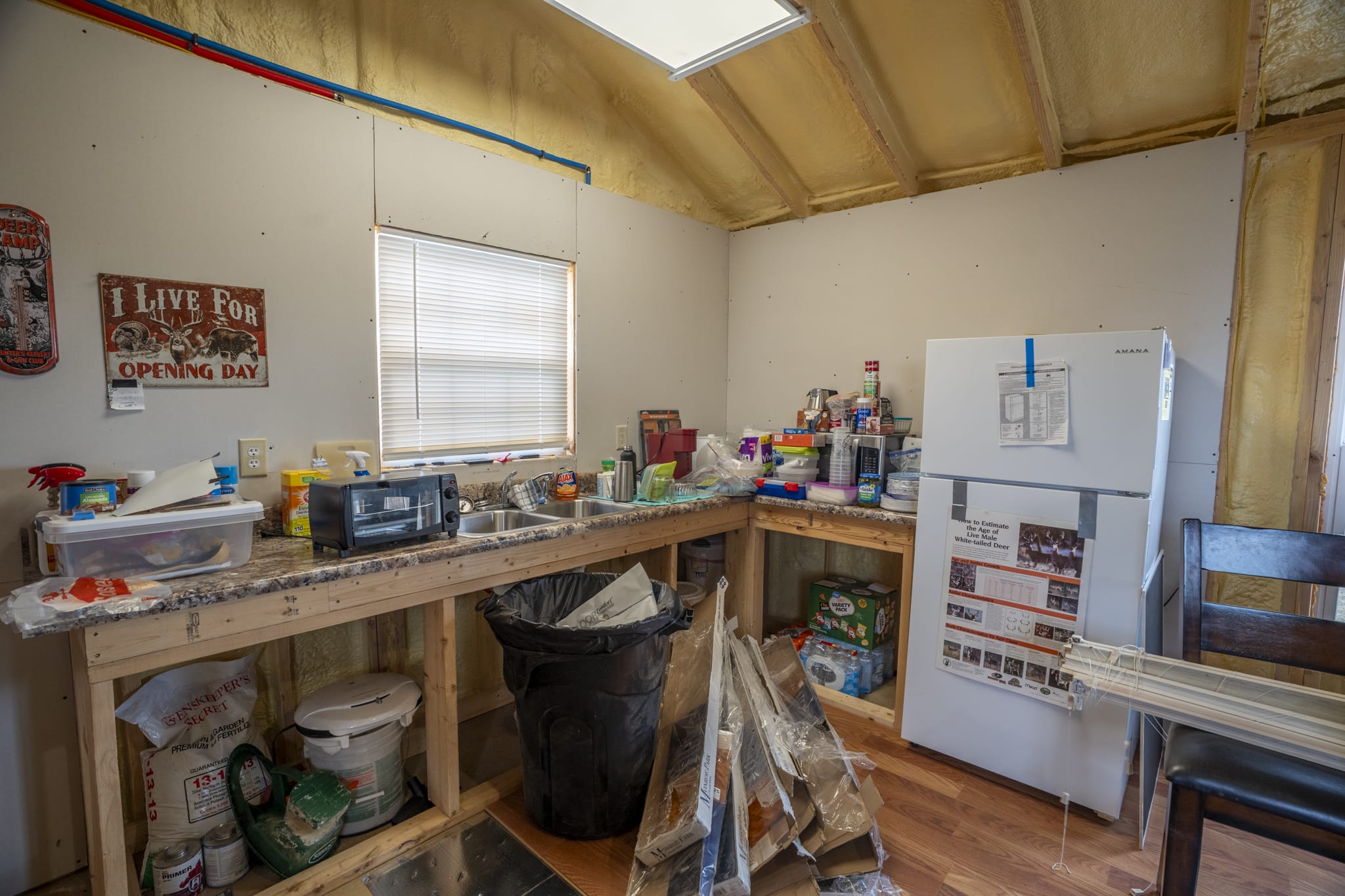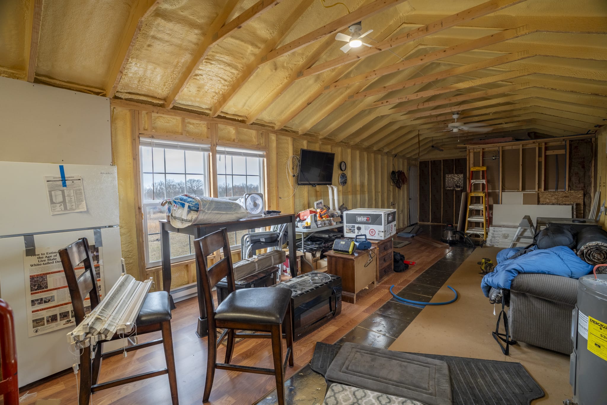 2x4 construction on piers with a crawlspace, spray foam insulation (1" ceiling,2" walls), 2 ceiling fans, 2x8 subfloor, copper wiring, double pane windows, 2 insulated steel doors, 40 gallon water heater, pex plumbing, new fridge, 2 microwaves, 2 steel strap anchors, heat trace water line, GFI receptacles, laminate flooring being installed, 200 amp service, heat pump & electric baseboard, bonus wood stove, mini split a/c and rural water.