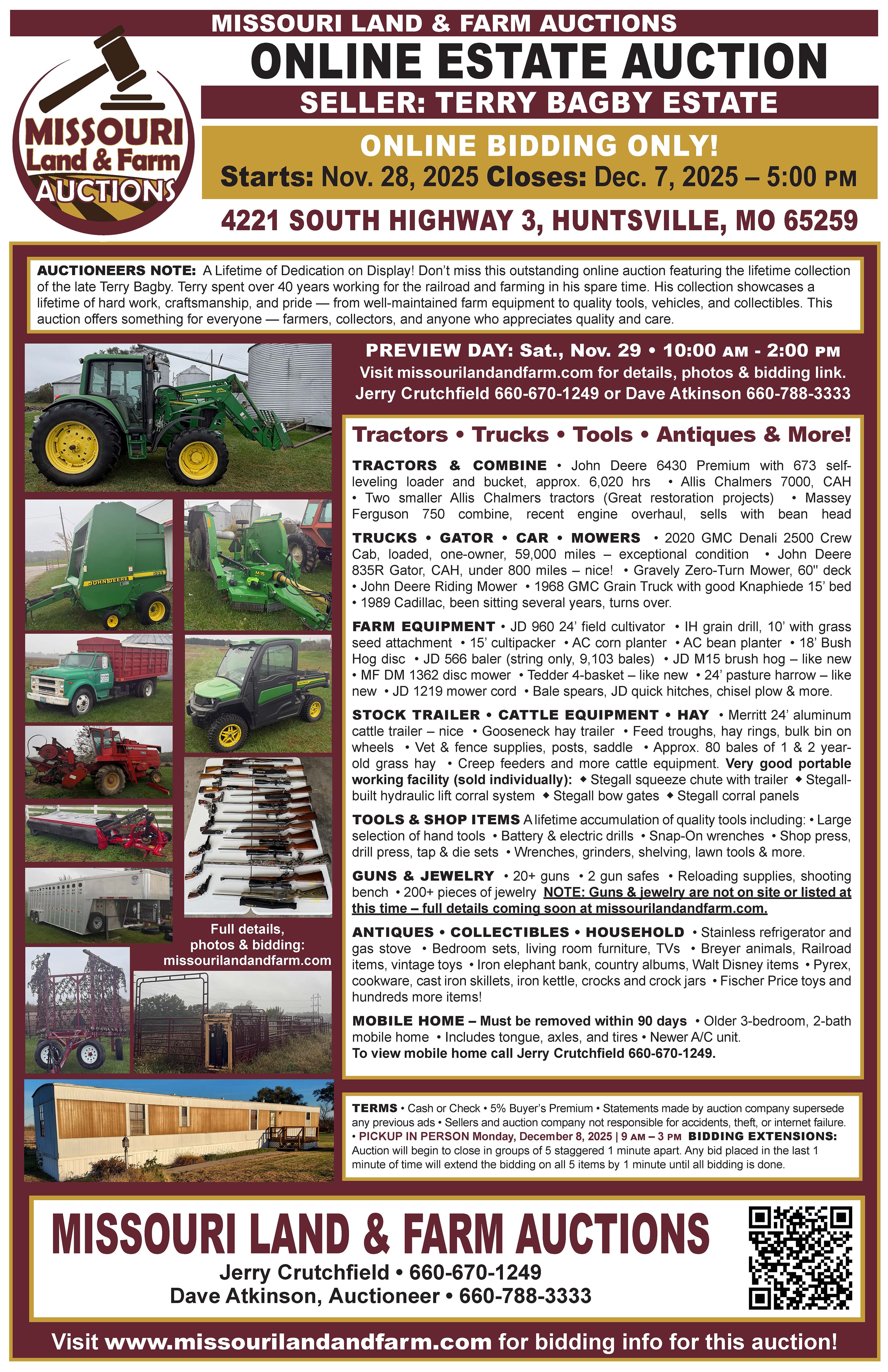 Online Auction ONLY! If you need assistance registering, viewing property or items PLEASE CALL OR TEXT - Dave Atkinson at 660-788-3333. Missouri Land and Farm is not responsible for accidents, theft or internet failure.